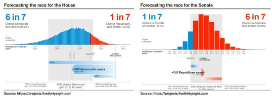 民调机构FiveThirtyEight的数据显示,民主党重掌众议院的可能性为86%,而共和党有85%的机会继续控制参议院。
