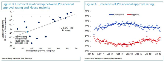 另外,德银发现,从通用选票民调(generic ballot poll,通过询问选民会直接投给哪一个党派候选人或选民更青睐哪一个党派)和总统的民意支持率这两个角度来看,都显示民主党在众议院的表现领先。
