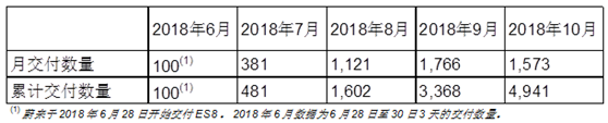 2018年第三季度,蔚来ES8交付量相比二季度的100辆,本季度大幅提高至3268辆,预计第四季度交付6700-7000辆;自6月28日开始交货到9月30日,公司已售出3350辆ES8,预计2018年下半年实现1万辆ES8的交付目标。