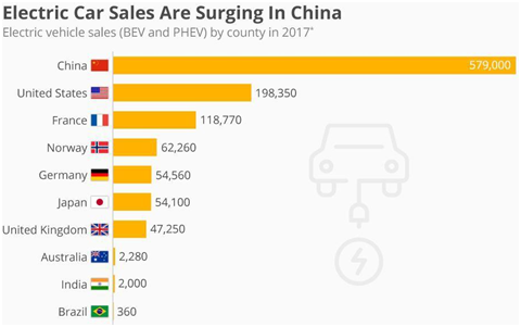 到2017年为止,全球电动汽车保有量超过300万辆,相比2016年增长了57%,打破历史记录。其中,中国的电动汽车保有量达到了123万辆左右,是电动汽车保有量最高的国家,占全球电动汽车保有量的40%左右。排在第二名的是欧洲,保有量约为82万辆;美国电动汽车保有量大约为76万辆,排在第三。