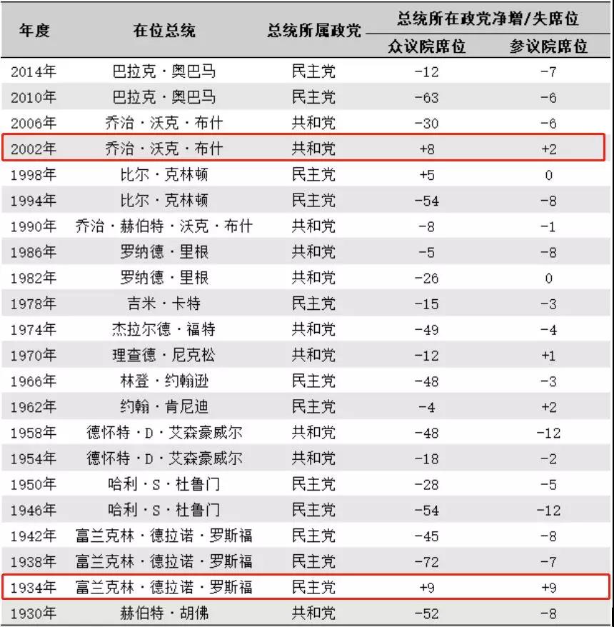 只有二战前经济大萧条时的罗斯福和9·11之后的小布什,出现过总统所在政党在中期选举中增加席位的情况。