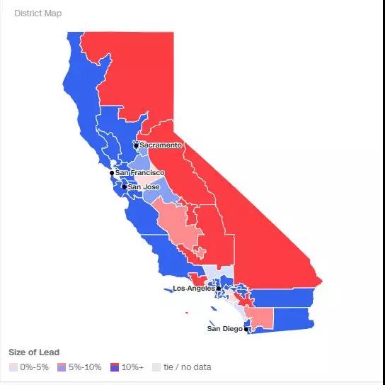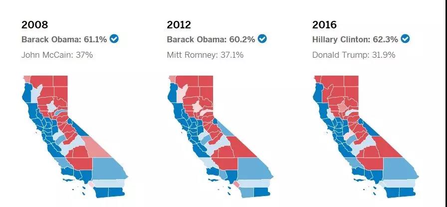 最直观的就是作为民主党票仓的加州,这是过去三次选举加州的情况,虽然红色比例越来越高,但是蓝色仍然占优。