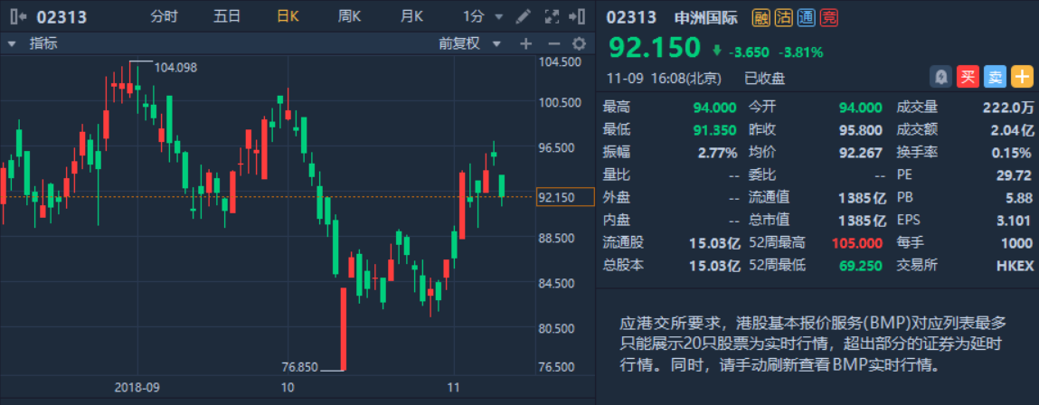 集团采用一体化的经营模式,承载所有生产工序。在同一工业区内,包括面料纤造、染色及后整理、印绣花至裁剪及缝纫。以提升工艺技术及制造水平,为客户提供一站式的优质服务。截至2018年6月30日止之半年度业绩为营业额增长10.8%至91.6亿元人民币,税后盈利21.79亿元人民币上升21.1%。期内整体毛利率增加0.6个百分点至32.3%。可于现价92元附近买入,中长线可见115元,跌穿81元止蚀。