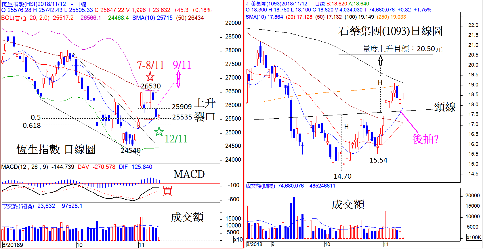個股方面,石藥集團(1093)在上周五低見17.80元後回升至18.30元收市,呈現「錘頭」的見底形態。更重要的是,「錘頭」底與「頭肩底」頸線的後抽支持位極接近,由此顯示,後抽可能已經在上周五結束,亦即後市繼續有機會朝向「頭肩底」量度上升目標20.50元進發。