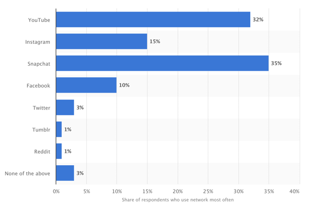 上图可见,美国青少年中35%选择SNAP,32%选择YouTube,选择Facebook只有10%。还有统计数据显示,在13-17岁的美国年轻人中,使用Facebook的只有约680万。