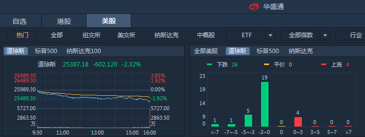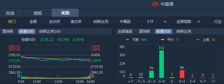 周一美股大跌,道琼斯跌幅2.32%,标普500收跌1.97%,纳斯达克跌幅2.78%。
