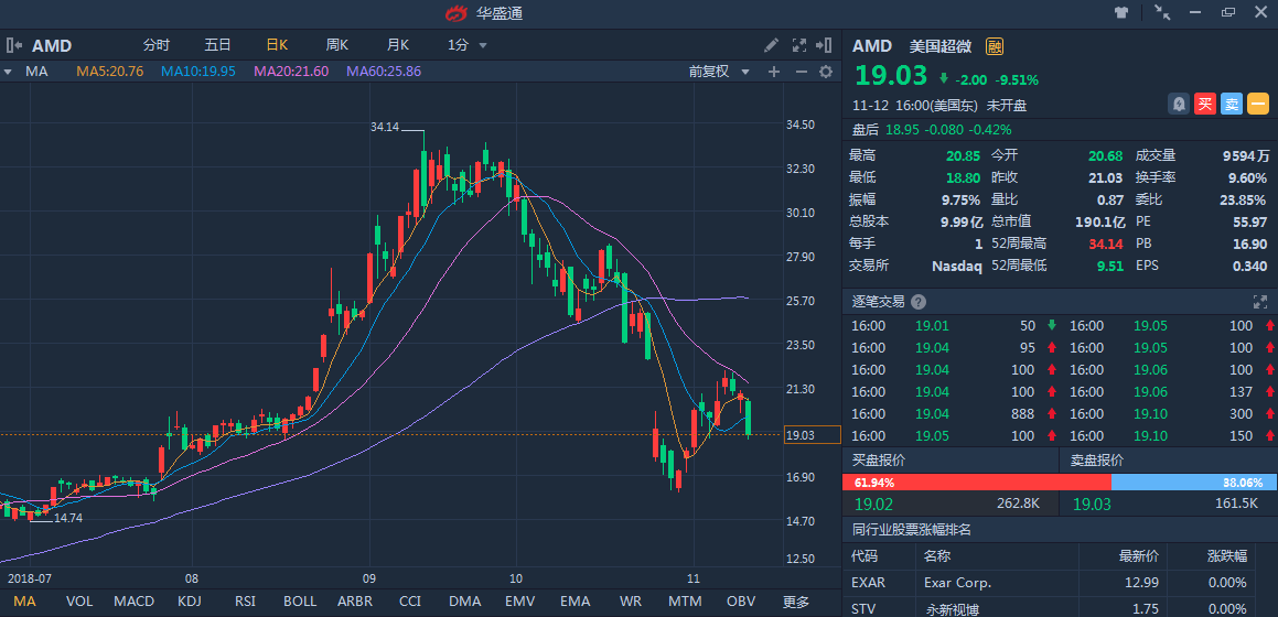 经历Q3财报、关税及中期选举后,公司股价进入平稳演化期,当前的20美元与纳入关税影响后反映远期盈利的水平相近。19年公司CPU市场有望继续夺取市场份额,而显卡可能因市场增幅放缓受到不利影响。若不考虑未来贸易战升级,19年公司股价有望增至25美元左右,如果贸易战解除,那么还将有3美元的对应风险收益。
