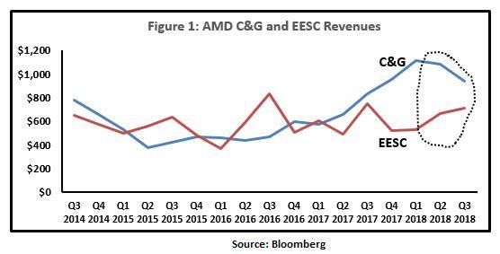 另外,公司的运营利润率稍向CG业务倾斜,比如公司近期推出的数据中心EPYC服务器芯片利润率更高。历史上其业务利润率至少比EESC业务高10%,差距在近几个季度比较突出,比如Q1的12.38%对应2.63%,且季度CG业务首次利润超过EESC业务。CG业务的良好表现显示出公司重点由EESC业务向高利润CG业务的战略转移。不过,Q3为连续第二季度公司CG业务增速慢于EESC,具体原因是因为计算业务的增长无法抵消因显卡需求不足带来的图像业务的疲软。数字挖矿需求的快速下滑开始对CG业务形成伤害,不过未来影响将会减弱。