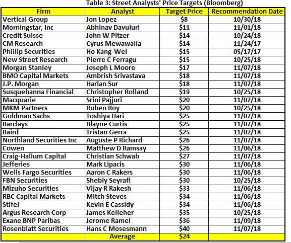 基于以上考虑,对应18年Q4至19年Q3期间不同的业绩预期,笔者给出对应的目标价为20、21.7、22、23.2及26.1美元,以上价格仅为短期波动的可能范围,并非公司长期的基础面对应价值。