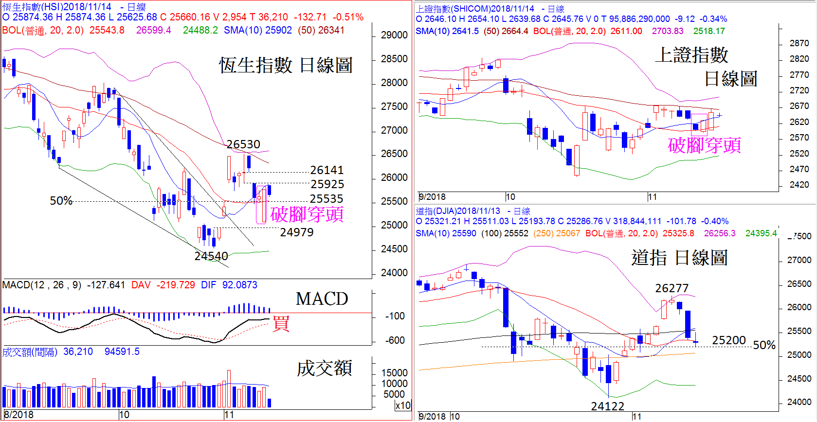 事實上,外圍的市況也大致上有利恆指向好:首先,上證指數繼周一以「破腳穿頭」的見底形態守在20天平均線支持以上收市之後,周二即以另一支陽燭穿破10天平均線高收,顯示短期走勢向好。其次,道指昨日低見25193之後以「十字星」的轉向形態收市,其底部亦剛好守在近期升幅的0.5倍回吐位25200之上,具有一定的短線見底意味。