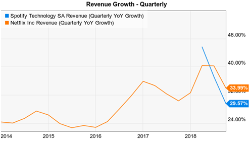 估值方面,相对于视频流媒体巨头的奈飞,公司的估值仅为前者的一半。但需要注意的是,两家公司的收入增速其实相差并不太大。通过下图,可以看出,公司目前的市现率水平为4倍左右,而奈飞则接近9倍;季度收入同比增速,Spotify为29.57%,奈飞则刚超过30%,为33.99%。