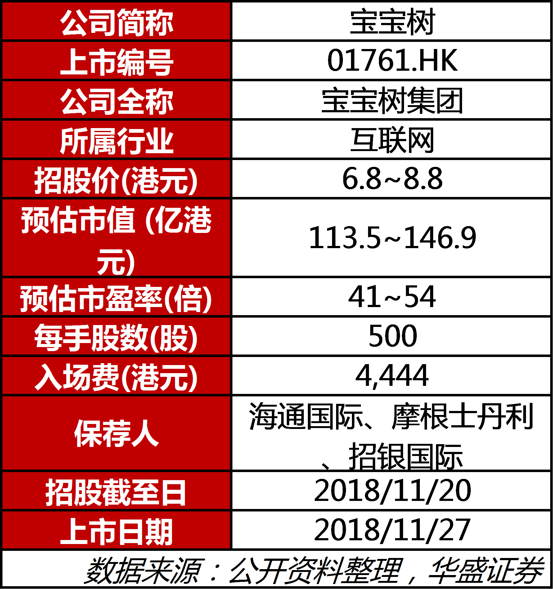 按照招股书披露的数据,宝宝树上市市值为113.5至146.9亿港元,按照半年经调整净利润1.22亿简单转化计18年利润后,对应的18年的预期市盈率为41.4至53.6倍。考虑到阿里巴巴对宝宝树可能带来的重要潜在影响力,这之中包含了一定的估值溢价。而对标同样是阿里入股的综合性社交平台微博,其2018年的预期市盈率为21.48倍。未来需要期待阿里巴巴与宝宝树的合作能够带来化学反应,促进公司长远的发展。