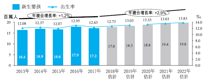 作为一个垂直类的母婴社区平台,宏观上最重要的就是国家整体的婴儿出生和增长情况。从人口上看,我国人口的出生率维持在千分之十二左右,随着2016年全面二孩开放,每年出生人口达到了1700万水平并预计在未来五年以2.9%的水平复合增长。
