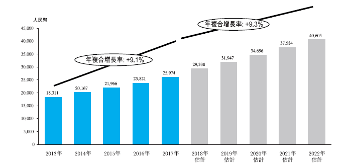 而根据第三方沙利文的数据,我国面向孕前2年至6岁儿童的市场规模在2017年达到了11万亿元人民币。互联网用户渗透率持续提升,在2017年已经达到了55.8%,预计到2022年能达到68.1%。其次,居民收入水平进一步上升,2017年收入达到25974元人民币,并预计未来五年复合增长率达到9.3%。