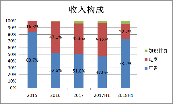 从毛利率上来看,毛利从高到低分别是知识付费,广告及电商。由于毛利率相对较低的电商业务持续收缩,整体毛利率由2017年上半年的60.4%提升至2018年上半年的76.8%。而招股书披露的信息显示电商未来将继续收缩,因此毛利率将会有进一步提升的可能性。