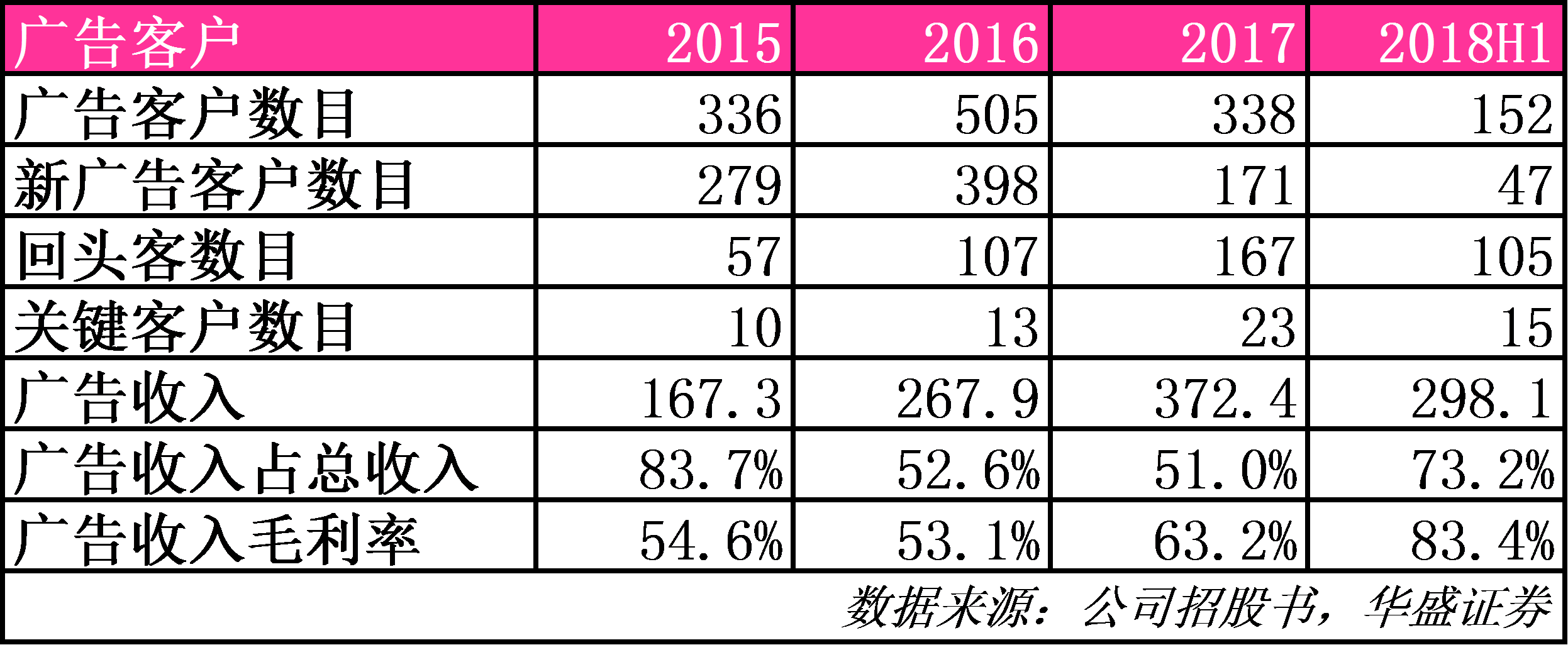 具体来看,2018年上半年广告部门的毛利率达到83.4%,宝宝树对毛利率提升的原因在于集中倾向于与主要客户开展业务,提高了主要客户的付费而达到规模效应,使得毛利率创下新高。而公司的广告客户数精简至152个,新增广告客户仅47个也说明至少在上半年公司这部分的收入驱动主要以提高主要客户的业务为主。2017年广告业务的五大客户占比由25.7%提升至31.4%。主要客户包括美素佳儿,惠氏等知名品牌。