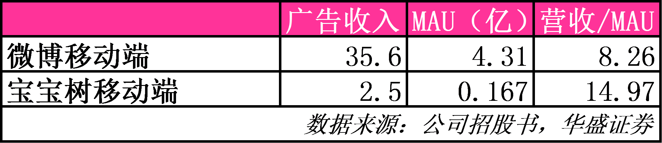 对标微博,以2018上半年财报的数据来看,微博移动端月活跃用户4.31亿,以微博此前披露的移动端营收占广告总体80%计算,移动端广告营收35.6亿人民币,微博的广告收入/MAU为8.26,而宝宝树APP的广告收入/MAU为14.97。这一方面说明宝宝树拥有垂直类电商的一些优势,在创造广告收入方面效率很高,另一方面也说明进一步挖掘单位用户价值的潜力上,宝宝树已经处于一个非常高的水平上,未来的营收增长可能更加需要依靠用户的增量以及来自于阿里巴巴的支持。