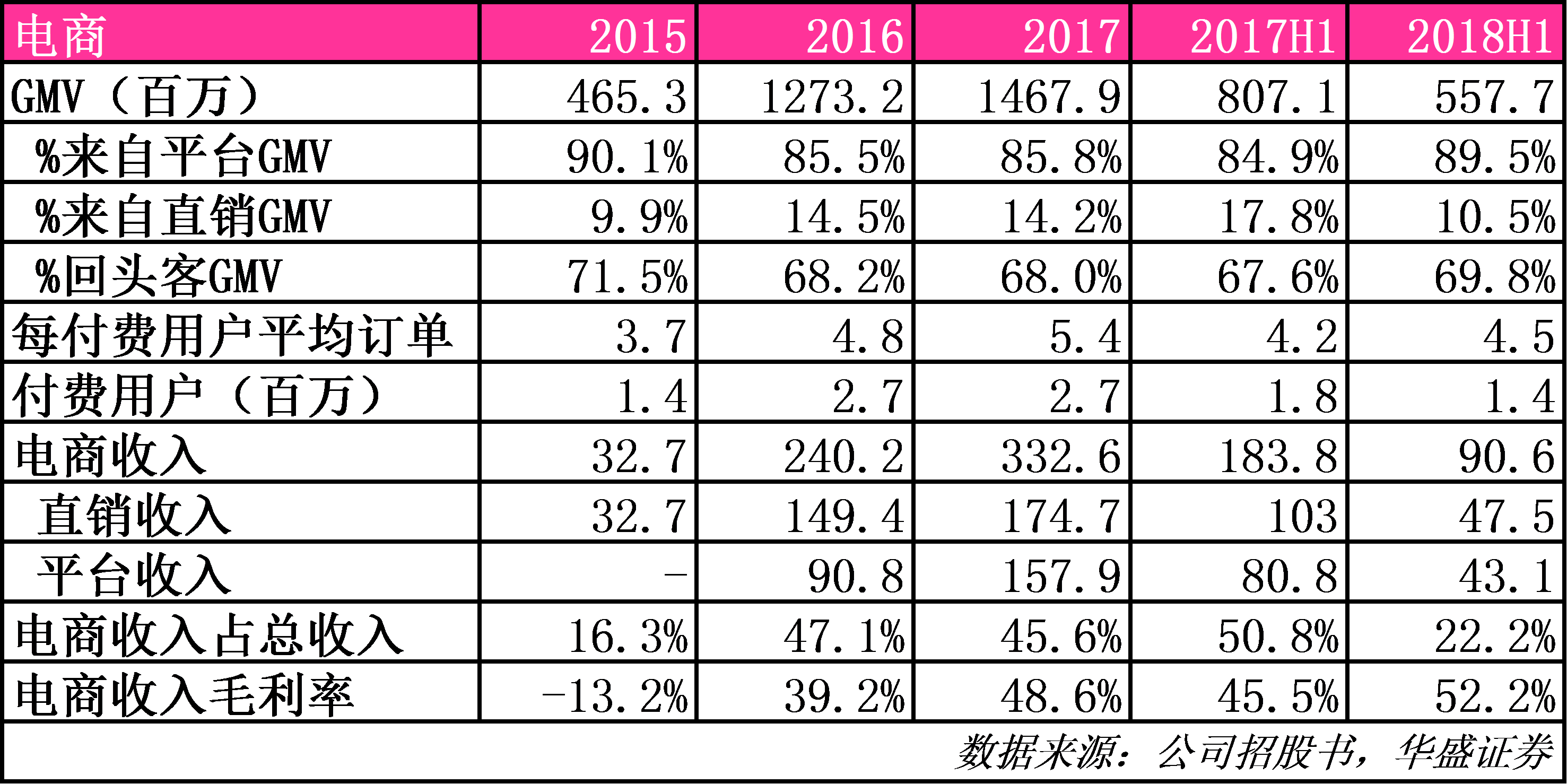 2018年上半年电商业务营收0.9亿同比下滑50.8%,其中直销0.48亿平台0.43亿均大幅减少。GMV有去年同期的8亿大幅缩减至今年的5.6亿。付费用户也由去年同期的1.8亿减少至1.4亿。但是相对应的是电商整体毛利率进一步提高,由45.5%提升至52.2%,主要是由于直销收入减少导致相应的存货等支出减少,变相提高了毛利率。
