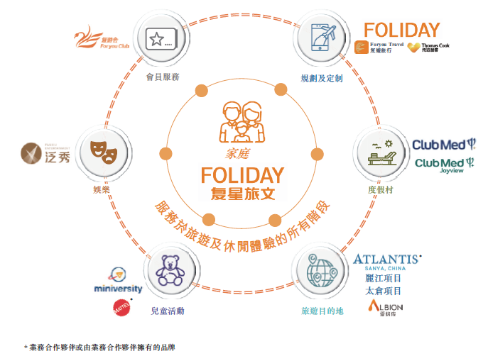 复星旅文目前包括度假村业务、旅游目的地业务和基于旅游和休闲场景的服务及解决方案三大业务板块,拥有源自法国的专注家庭客户的一价全包休闲度假体验的Club Med(地中海俱乐部),高端一站式娱乐休闲及综合旅游度假目的地三亚·亚特兰蒂斯,投资了世界上历史最久的领先旅游集团之一Thomas Cook,并与其成立了合资旅行社酷怡。FOLIDAY旗下业务还包括旅游目的地专业运营商爱必侬、文化和娱乐活动提供商泛秀、国际亲子玩学俱乐部Miniversity、在线旅游平台和旅行社复游旅行,以及全球会员俱乐部复游会等。