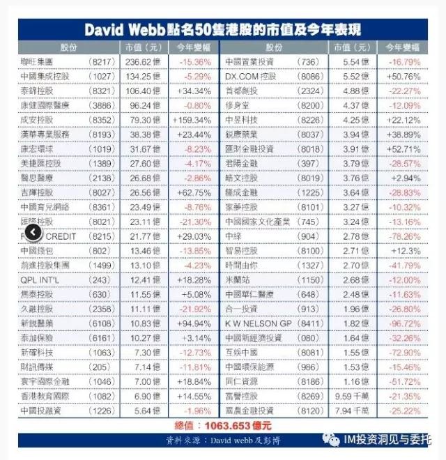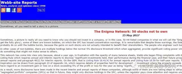 5月15日,香港著名的独立股评人David Webb在其网站发表题为"The Enigma Network: 50 Stocks not to own (迷之网络:50只不能持有的港股)"的文章,列出50只港股"黑名单",提醒投资者不要购入相关股份。