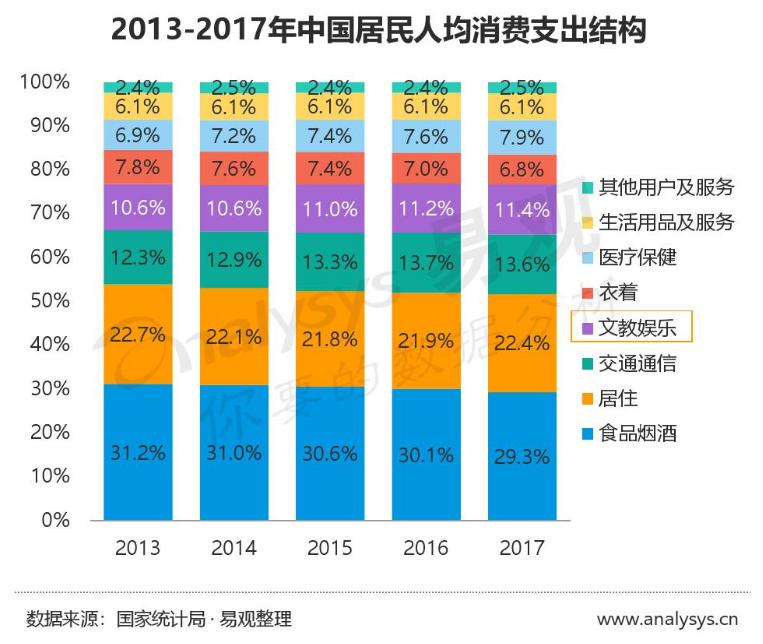 数字内容的需求端对应着正是人民群众日益增长的精神文化需求,也可以说正宗的消费升级概念,从下图看到过去五年时间里,“文教娱乐”在中国居民人均消费支出结构中平稳增长。供给端版权的规范化也在激励着所有的创作者,而且由于移动互联网时代内容生产门槛降低,整体呈现出愈加多样化和丰富的特点。根据易观,2017年中国网络核心版权产业行业规模达6365亿元,同比增速27.2%。