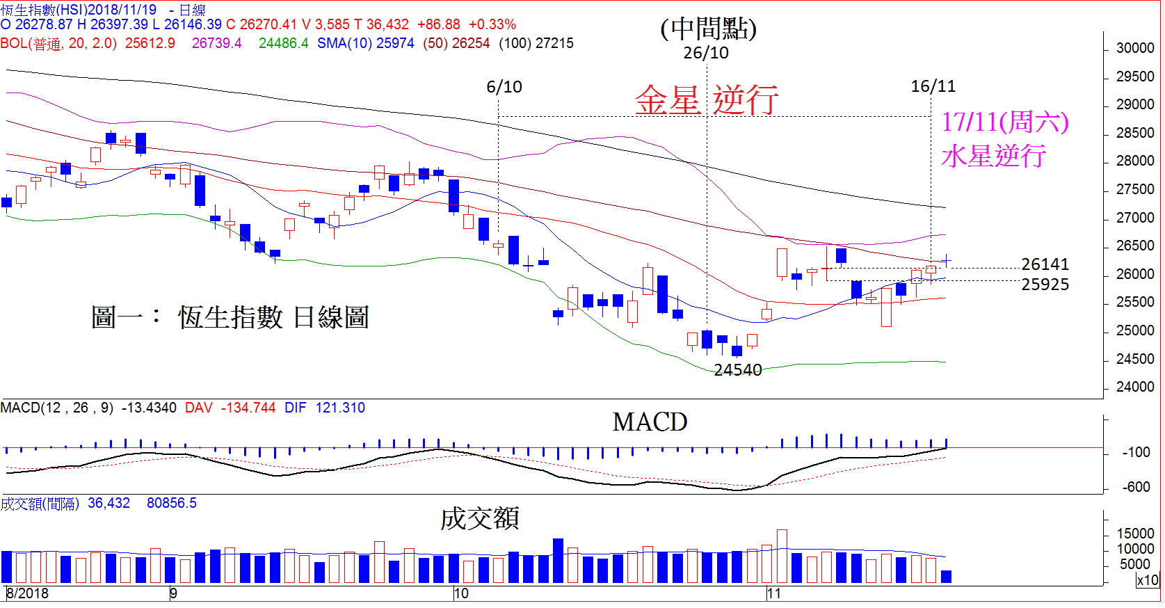 從日線圖看,恆指上星期尾段完全回補了介乎於25925至26141之間的下跌裂口,加上MACD維持明確的買入訊號,顯示短期走勢向好,見圖一。不過,除了恆指今早升抵50天平均線阻力位26255之外,從星象周期的角度看,短期升勢也可能隨時逆轉: