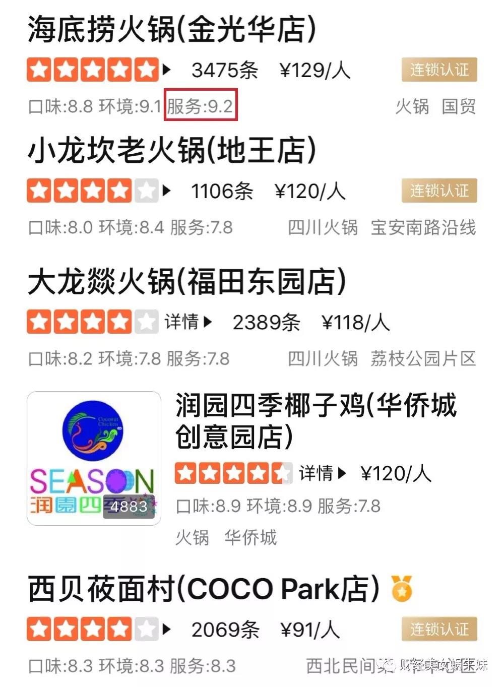 但是海底捞是完全相反的:在海底捞金光华店的分数中,口味是三项中最低的8.8分,服务分达到了超级高的9.2分,这个店的人均消费金额碾压了深圳超火的椰子鸡,实在是厉害!