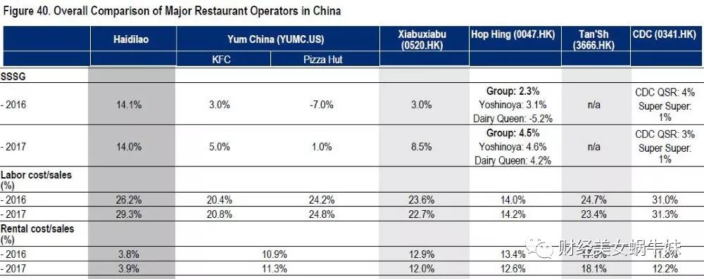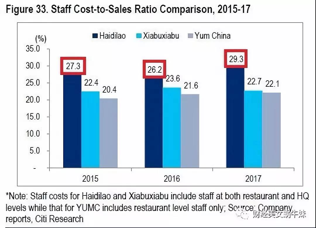 你们也许会说,HF的薪水这么好,火锅店怎么能跟他们比。但从P&L上横向比较,海底捞给员工的薪水比例,是比像呷哺呷哺等同业要高的。