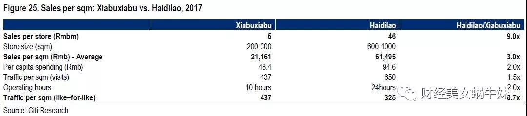 海底捞2017年的人均消费金额是95块,两倍于呷哺呷哺;而且海底捞还特别努力,有些店是24小时营业,所以海底捞的每平方米销售面积是呷哺呷哺的三倍。