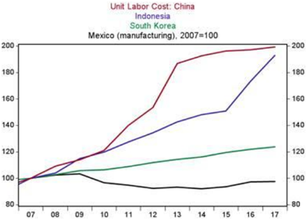 文章特别指出,中国的劳动力成本快速上升,尤其是在东部省份,大批企业与出口贸易相关,这将无疑降低中国国际贸易的相对优势,减慢中国的经济增速。通过下图可以发现,单位劳动力成本方面,红色线条代表的中国处于最高位置,其次为印尼、韩国、墨西哥,印尼和墨西哥可以理解,但是作者列举韩国的数据不敢苟同;而且我国与印尼相差不大,考虑到产业转移不仅只是劳动力成本因素,更多的是相关配套基础设施的建立:电、水、安全性等要素,因此,若从作者的数据来看,中国的劳动力成本仍然具有一定优势。