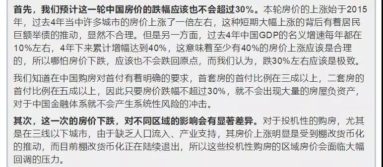 此外,姜超认为,中国房价下跌的空间十分有限。特别是代表良好教育医疗养老等社会资源的一线城市,没有什么泡沫。但是姜超也说,跌30%是极致。