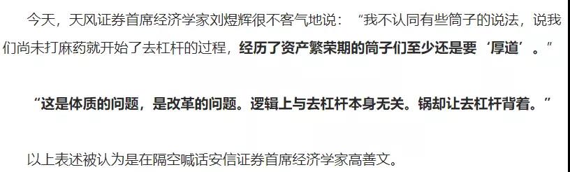 年中,安信首席高善文针对去杠杆过猛,提出“蒙古大夫做手术不打麻药,病人喊疼就把嘴堵上”,高博认为,去杠杆的过程中不应实施过于紧缩的货币政策。这会导致民营企业的财务困境、乃至破产倒闭。