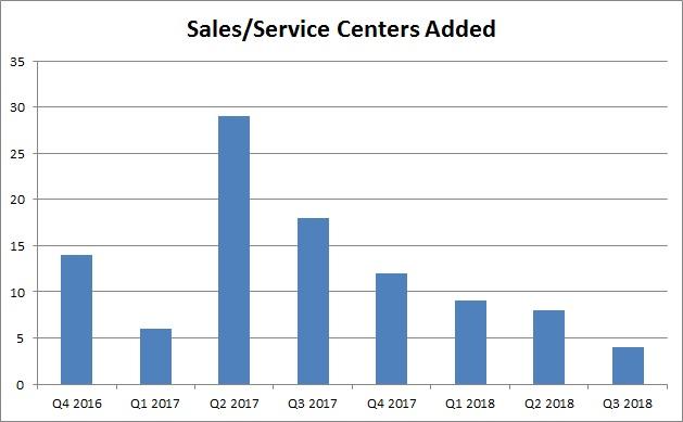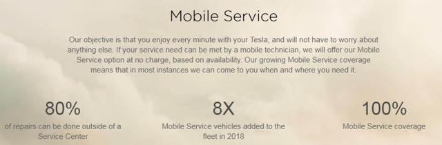 公司喜欢宣传移动服务团队,表示大部分维修服务可在服务中心外提供。如下图,18年规模增长相当快,不过比对不同季度的致投资者信可以发现问题,17年Q4公司表示服务规模年内翻倍,部分受益于服务中心扩建,其中50%受益于已有中心的效率提升,加上移动服务团队的规模扩张,移动服务团队当前拥有230辆车。18年Q3则表示,移动服务规模持续拓展,季末路上服务的车辆数量为373辆。按照翻倍的说法,假设17年年初拥有车辆约120辆,那么17年新增车辆为110辆,18年新增153辆,与官网的8倍增长描述有出入。