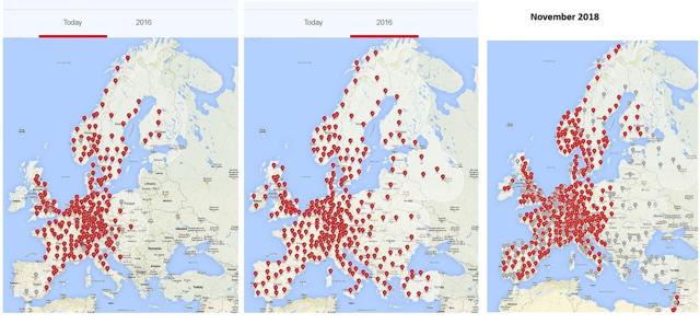 关于服务中心问题,如下图,16年公司多次宣布削减新增计划,基本上管理层预计年内新建70座服务中心,但之后计划削减了一半,之后数量仅有少量增长。17年前三季度公司新增53个销售/服务中心,随着Model 3的爬坡量产,也许有人会认为路上车辆增长会带来服务中心的更快增长。然而,实际上18年前三季度服务中心新增仅21座。不同季度公司致投资者的信件提到的数据差距明显,17年Q4表示Q4新开12家服务中心,全年全球总计330座中心,而18年Q3表示Q3新开4座中心,季末全球总计351座服务中心。