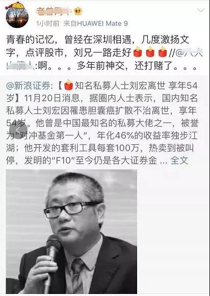 今日,中国私募市场传奇人物刘宏,博弘投资管理有限公司前总经理,因罹患胆囊癌扩散不治离世,享年54岁。此讯一出,许多业内人士表示哀悼。