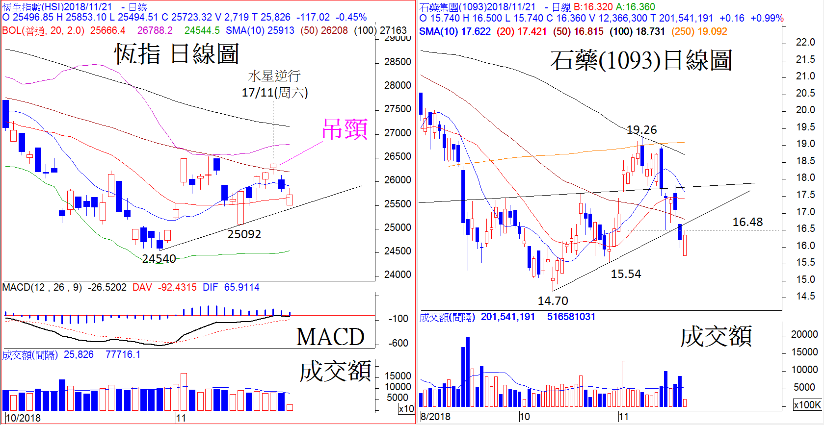 實際市況顯示,雖然恆指周一並沒有跌回50天平均線之下收市,但卻形成了「吊頸」的初步見頂形態。翌日當恆指裂口低開及以陰燭跌回50天平均線支持以下低收之後,短線見頂的形勢亦變得明確。不過,「水星逆行」周期方興未艾,要一直維持至12月7日才結束,在此期間,恆指的走勢多數會飄忽不定,兩日急升後又會突然急挫兩天,當看似下跌時,走勢又會突然逆轉,令好淡友都損手。所以,怕波動的投資者,在「水星逆行」期內宜小注怡情或採取觀望態度。