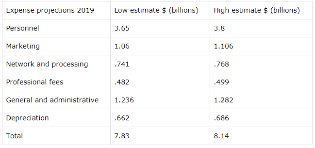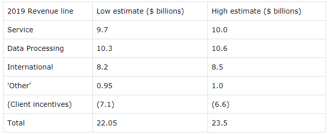 交易营收占公司总营收比例近三分之一,交易数量及交易额的持续提升为增长基础。考虑近期宏观市场因素,处理的交易量及交易总额预计同比提升10%至12%,19年各部分营收预计分别如下, 与用卡及支付网络使用相关的服务营收有望达到97亿至100亿美元;国际业务营收预计同比增速在15%至20%, 维萨品牌授权及认证相关的其他营收预计同比增速为高位个位数,最后给予的客户激励预计同比增幅为20%至25%。综合而言,预计19年营收范围为220.5亿至235亿美元。
