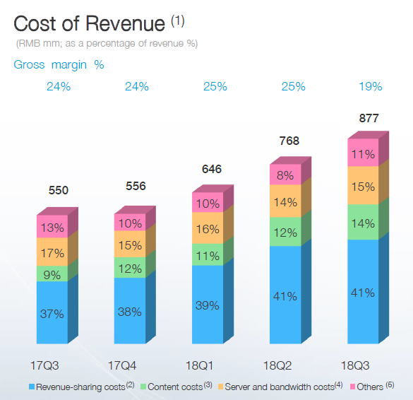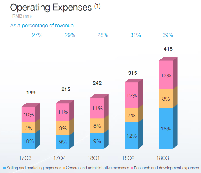 而除了由于游戏业务的增速受限而导致的整体营收增速放缓之外, B站的开支也在持续增加。首先销售成本同比增长60%,使得毛利率由此前几个季度的25%左右下降至本季度的19%。除了销售成本的上升之外,经营成本也在持续增加,由17年三季度营收的27%增加至本季度的39%,经营成本同比增长120%,其中市场推广费用同比增长161%。财报对此的解释是主要是由于与APP和品牌有关的渠道和市场投入,线下活动和暑期手游推广费用,以及人员成本增加。值得一提的是,费用的增长中有相当部分来自于内容安全方面的工作,及为了加强对内容的过滤和审核B站增加了大量的审核人员,并在上海之外建立了两个审核中心。最终B站净亏损2.46亿同比和环比皆大幅扩大,净亏损率23%,经调整净亏损也达到2.03亿。