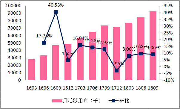 而在不那么优秀的财务数据的另一面,是较为十分靓丽的用户数据。首先B站的月活跃用户达到了9270万,同比增长25%环比增长9%,用户数正式突破9000万大关。
