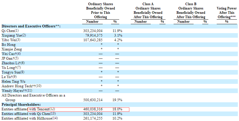 根据招股书披露,公司主要股东中,第一大股东腾讯持股18.0%,超过创始人陈琪11.9%的持股;另外高瓴资本持股10.2%,其他投资机构包括挚信资本、贝塔斯曼亚洲投资基金、平安保险持股6.3%、启明及红杉资本。