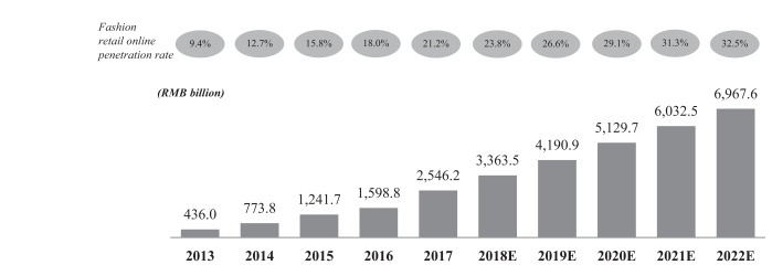 根据iResearch报告,国内线上时尚零售渗透率有望从17年的21.2%提至2022年的32.5%。随着渗透率提升对应零售电商规模将不断扩大,总交易额(GMV)有望从17年的25462亿元增至2022年的69676亿元,年复合增长率为22.3%,相对13年至17年的年复合增速55.5%有所放缓。