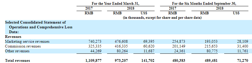根据财报,18财年公司营收为9.73亿元,相比17财年同比下降12.3%,按分项,佣金收入和其他收入分别增长27.9%和81%,而占比较大的营销服务收入则大幅减少35.6%,原因在于公司采用视频直播为主要的导流形式,减少营销客户的数量。2019年财年上半年营收约为4.89亿元,同比基本持平。直播贡献突出,18财年直播产生的成交额高达17亿元,约占总GMV的11.8%。2019财年上半年,直播6个月内便贡献14亿元成交额。