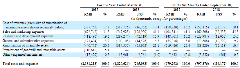 截止9月30日的19财年上半年,公司Non-GAAP净亏损达1.86亿元, 相比上年同期的净亏损2.52亿元收窄 26%。18年财年总开支费用为18.2亿元,同比下滑16.5%,且2019年财年上半年总支出费用为7.98亿,同样同比降低18.5%,主要得益于公司在人员裁减、换用云服务方面的努力。