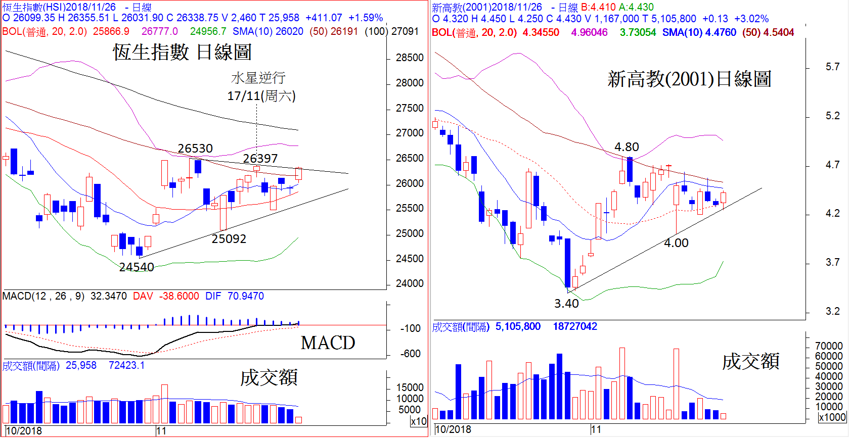 個股方面,上星期本欄提到:「『模擬基金』在4.30元買入了新高教(2001)。」而詳細策略是:止蝕位設於3.98元之下,目標暫看5.70元。實際市況顯示,新高教今早低見4.25元後掉頭回升,低位剛好獲得3.40元底部延伸的上升軌所支持,見底回升的機會仍在。事實上,股價11月16日在4.00元見底後,最終以「錘頭」及大成交高收,加上由4.80元下跌至4.00元的過程是明顯「三個浪」的調整結構,因此,只要守在4.00元的底部之上,短期內仍傾向造好。