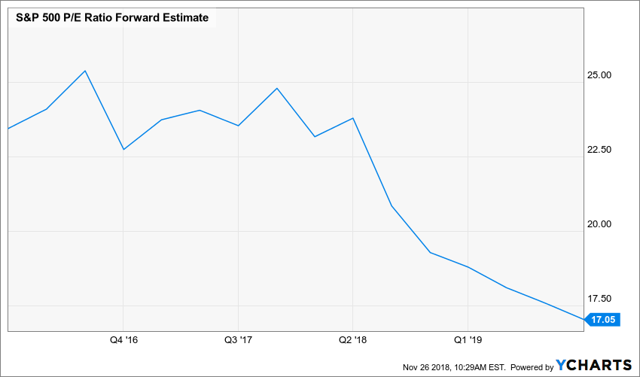 根据耶鲁大学2018年10月的数据,十年平均市盈率为16.179,而上图可见目前标普500平均市盈率在近一周内大幅下跌,接近十年均值,据此判断市场估值大致合理。