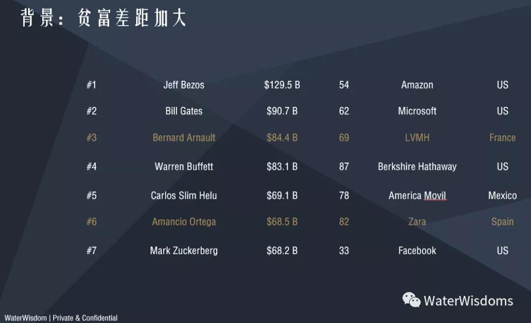 在股票市场,我们观察到,除了美国科技股外,最强的资产是奢侈品和廉价超市,以及信用卡公司(流动性释放的管道)。在全球Forbes富豪榜上,做奢侈品的LVMH老板和做廉价服装的Zara老板分列第三和第六。