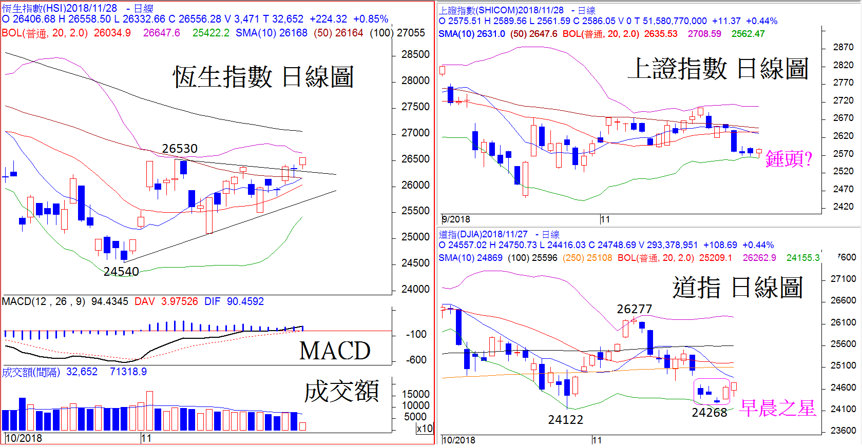 有鑑於A股和美股的表現不俗,相信會有利港股的升勢持續。就A股而言,上證指數今早先創下2561的一個月新低後回穩,低位剛好獲得20天保力加通道下限線所支持。如果最終靠近於2600收市,日線圖上將會形成「錘頭」的見底形態,繼而增加短線見底的機會。至於美股方面,道指於11月23日低見24268之後連續兩天以陽燭造好,在日線圖上構成類似「早晨之星」的見底組合。這個見底形態出現的位置是20天保力加通道下限線,因而增加其見底的威力。