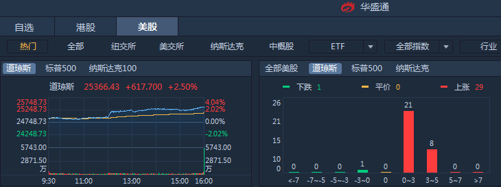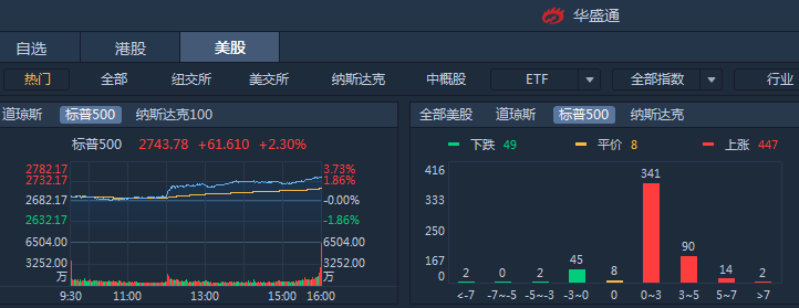 周三鲍威尔鸽派讲话提振股市,三大股指大涨,标普500收涨2.30%,道指收涨2.50%,纳指收涨2.95%。