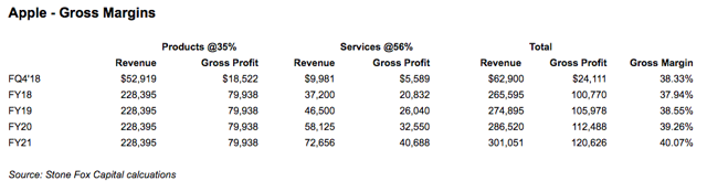 在此情况下,毛利率从2018财年的38%增长到2021财年的40%以上,毛利润三年内翻一番达到400亿美元以上。在此计算中产品分部由于不同产品的互相抵消所以忽略不计,所以该计算表明产品营收只需保持不变,公司毛利率就会出现上升,足以证明公司的服务分部提升毛利润的能力。