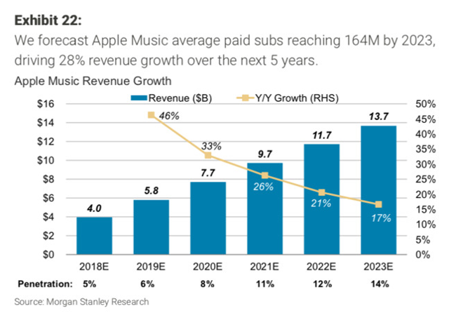 根据预测,苹果音乐的收入将从2018财年的40亿美元激增至2023财年的137亿美元,虽然利润率可能很低,但好在苹果音乐在2023财年的服务收入占比不到15%。